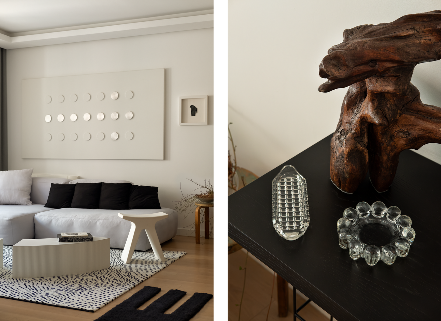 The apartment is the example of subtle yet bold mixture of vintage details and custom designed lighting and furniture pieces. Infused with light, bold detailing and distinctive materiality through use of aluminium, stone imitations, rich carpeting, mirrors and glass, the space represents a unique fusion of styles with a dreamy touch of postmodern aesthetics. Original oak wooden flooring is combined with neutral colour scheme, to give the space open yet cozy vibe, with an occasional touch of Yves Klein blue accents...